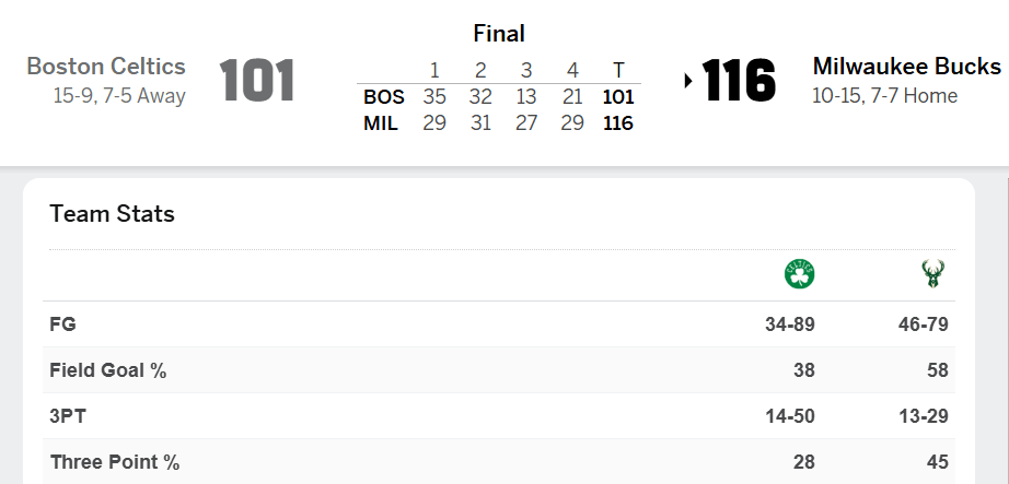 整場(chǎng)比賽結束后,凱爾特人命中率只有38%,其中三分球命中率更是只有28%(50投14中)。雄鹿整場(chǎng)的命中率則達到了58%,甚至在第四節還剩5分26秒時(shí)一度是61%(彼時(shí)69投42中)。