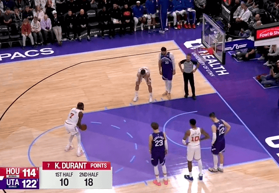 第四節比賽,到分杜蘭特四罰全中得到32分,下半下分下半場(chǎng)已經(jīng)砍下22分。場(chǎng)已