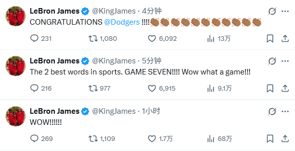 湖人球員勒布朗-詹姆斯發(fā)推稱(chēng)贊:“體育界最棒的恭喜兩個(gè)詞—搶七,無(wú)與倫比的流言?xún)蓚€(gè)洛杉比賽,恭喜洛杉磯道奇。板詹棒