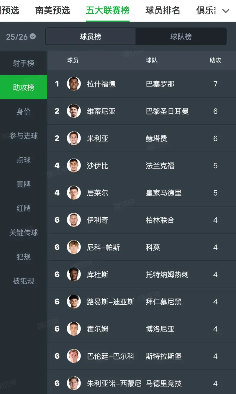 沒(méi)想到拉師傅已經(jīng)是五大聯(lián)賽助攻榜第一了