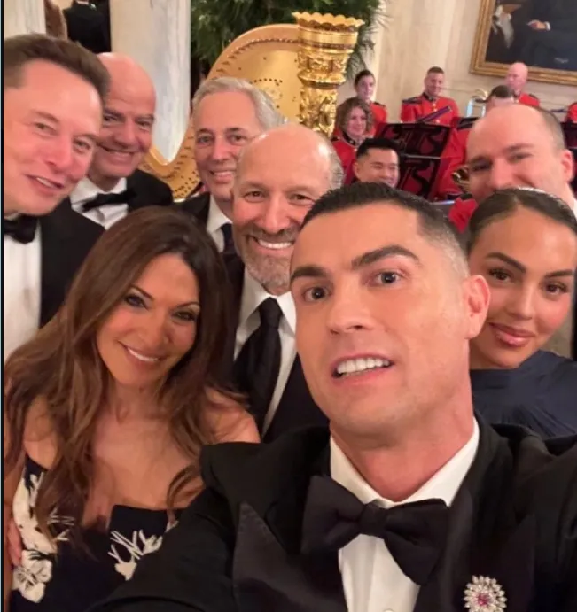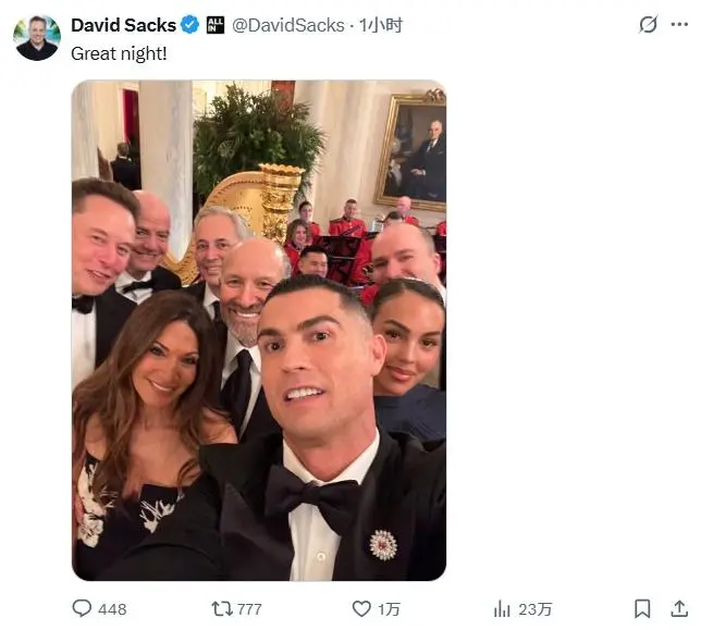 該圖為C羅拿著(zhù)手機自拍的自拍視角,圖中包括喬治娜、交際馬斯克、羅堆因凡蒂諾等人。名人之后馬斯克還在該推特下評論。白宮