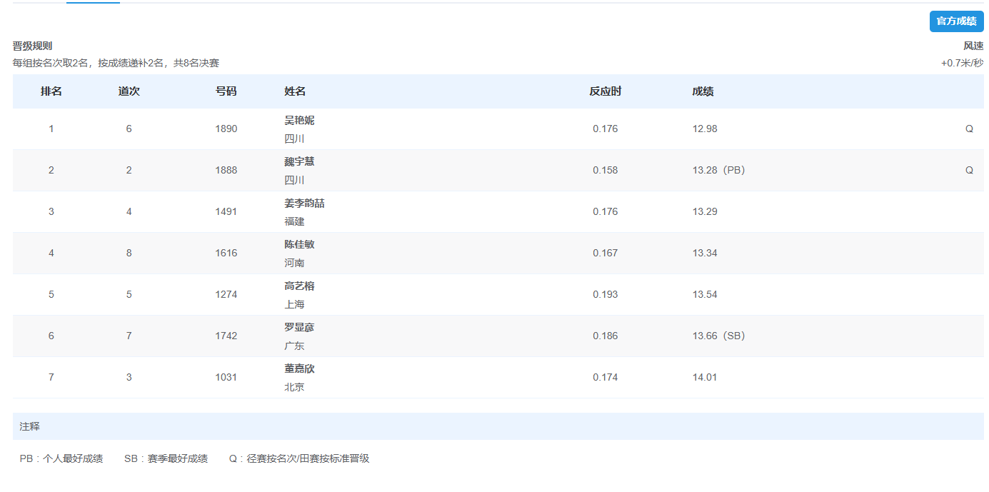 吳艷妮跑出12秒98,預賽小組第一晉級決賽,吳艷12秒98也是妮秒目前預賽階段的最好成績(jì)。