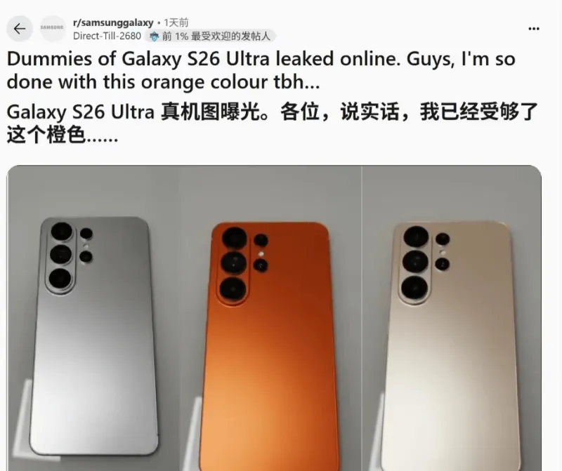 虎撲10月08日訊 網(wǎng)友 Direct-Till-2680 昨日在 Reddit 社區發(fā)帖,分享了一張照片,展示了三星 Galaxy S26 Ultra 手機的機模照片,共有銀色、橙色和金色三種,其中橙色不免讓人聯(lián)想到蘋(píng)果為 iPhone 17 Pro 系列推出的星宇橙顏色。