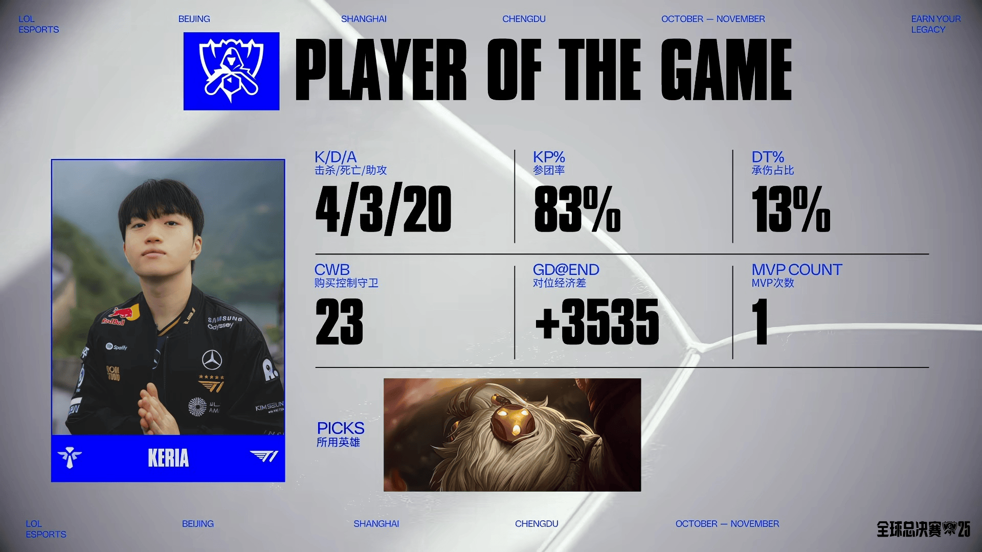 虎撲10月15日訊 在剛剛結束的S15瑞士輪的比賽中,Keria巴德砍下4/3/20的板K巴德戰績(jì),拿下T1對陣FLY首局MVP