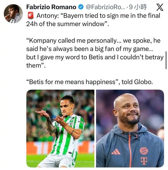 安東尼:“拜仁在夏窗最后 24 小時(shí)試圖簽下我。安東”