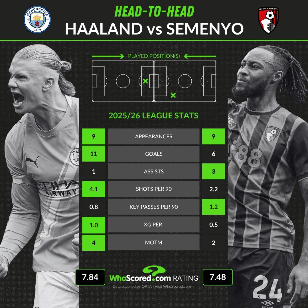 虎撲11月02日訊 英超第10輪,曼城對陣伯恩茅斯,對比賽前whoscored盤(pán)點(diǎn)哈蘭德與塞梅約本賽季英超數據(哈蘭德在前):