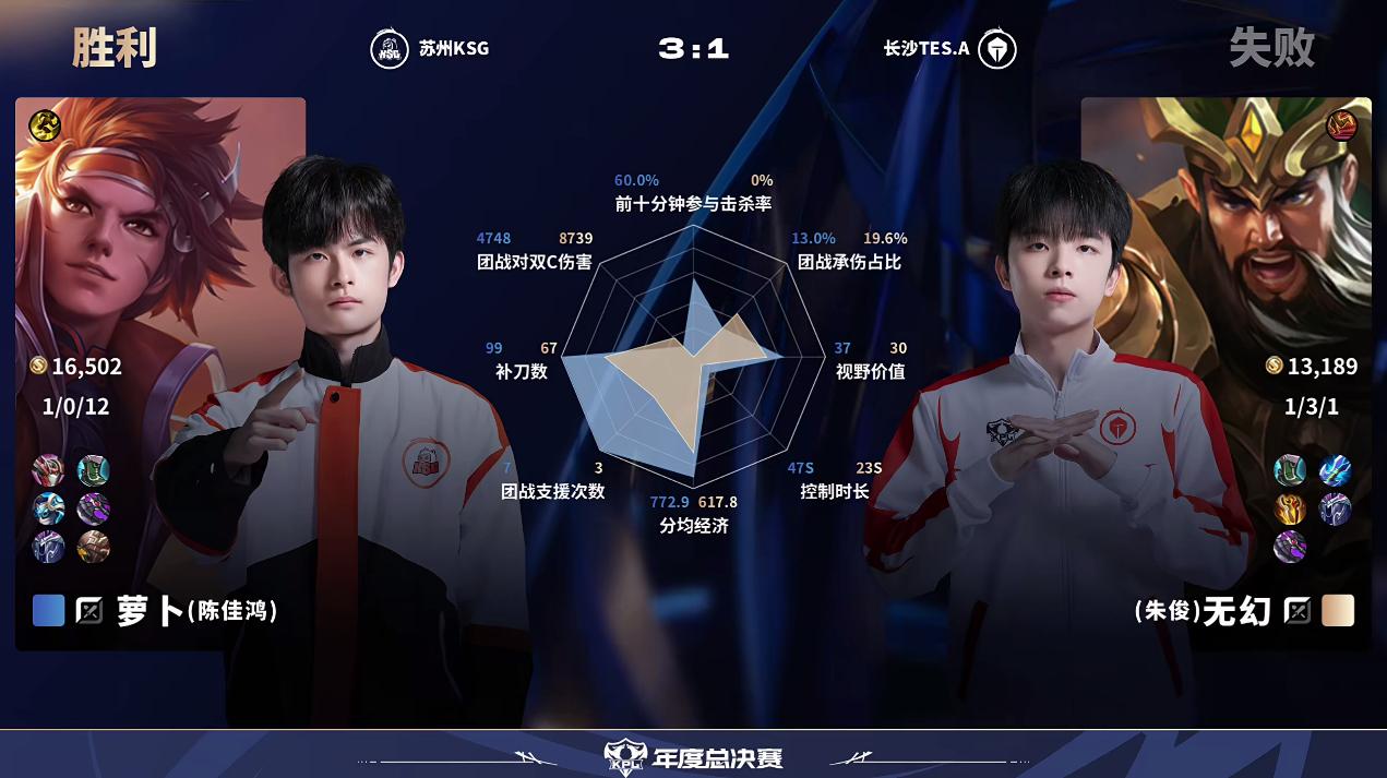 虎撲10月14日訊 KSG/TES第4局數據對比:句號大司命完美碾壓深巔夢(mèng)奇。