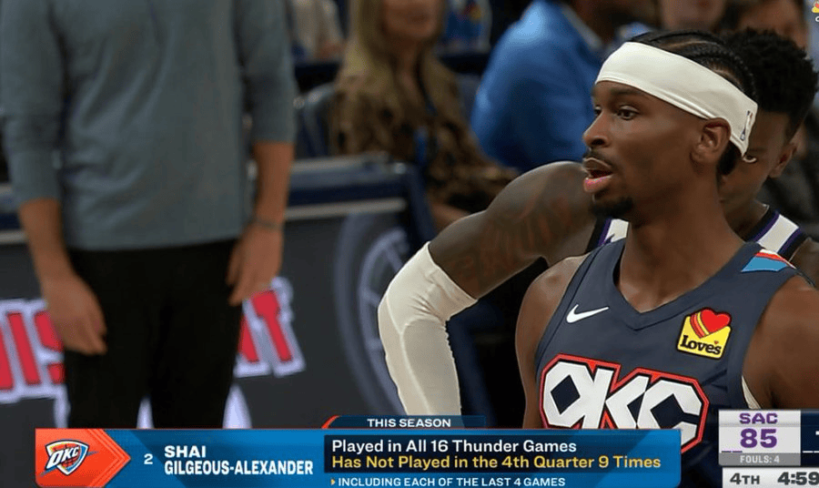 比賽第四節,去場(chǎng)亞歷山大重新披掛上陣,末節現場(chǎng)導播給出亞歷山大的賽季一項數據:
