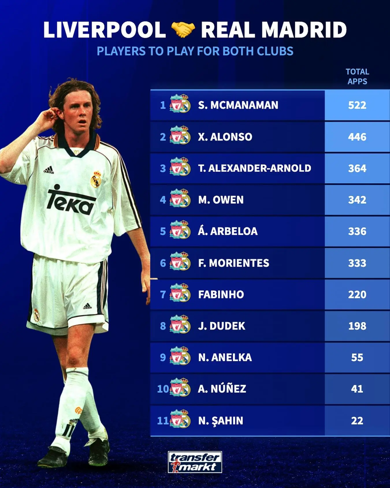 [流言板]為利物浦和皇馬出場(chǎng)總數最多的球員:阿隆索446場(chǎng)排名第二