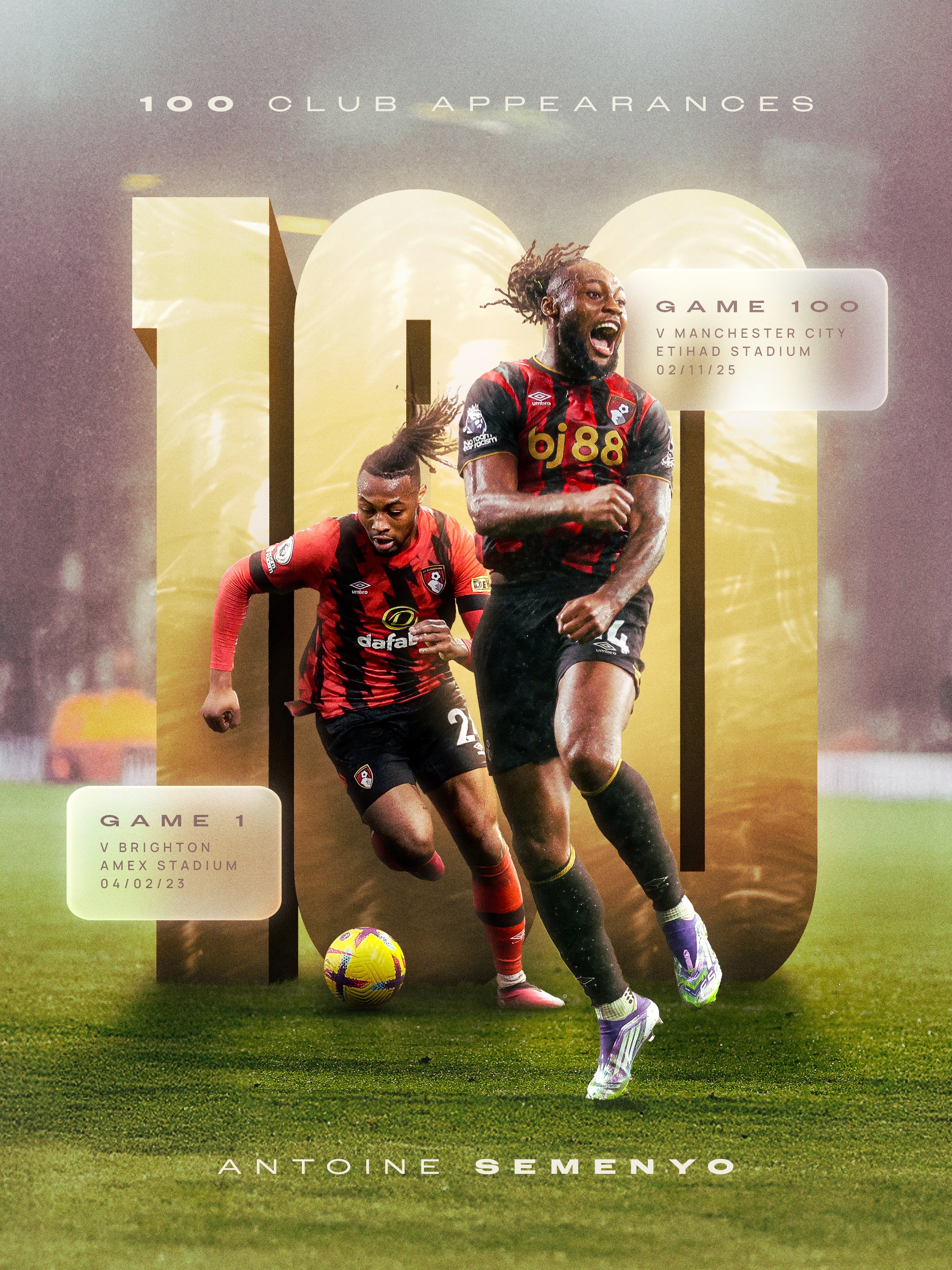 本場(chǎng)比賽也是恩茅塞梅約伯恩茅斯生涯的第100場(chǎng)里程碑,俱樂(lè )部官方發(fā)布海報祝賀。斯生