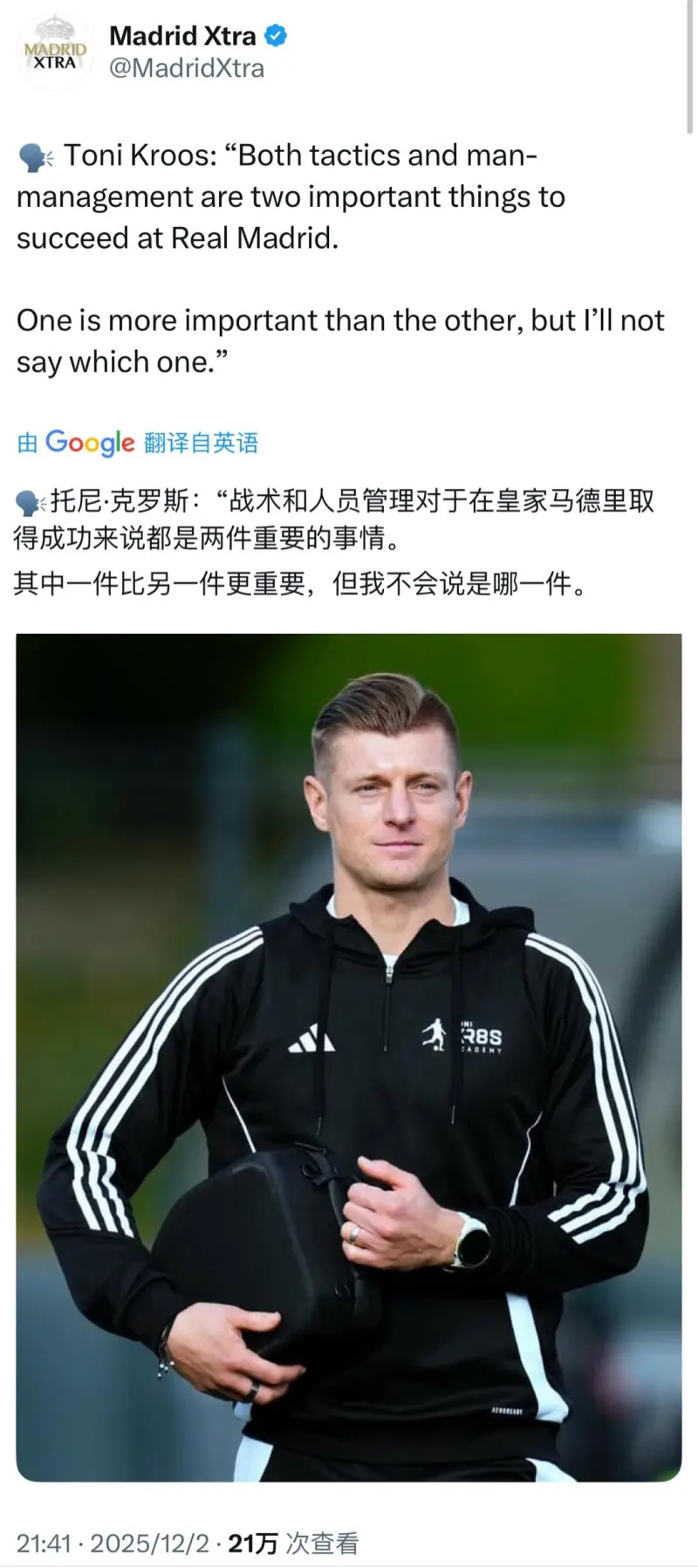 克羅斯:戰術(shù)和更衣室對球隊成功都很重要,其中一件比另一件更重要,但我不說(shuō)